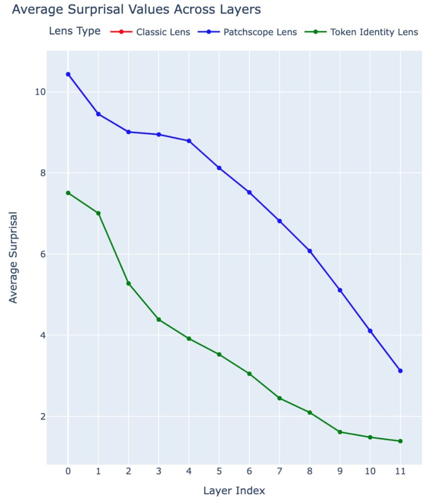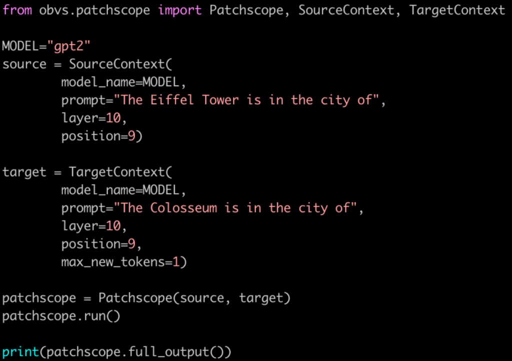 obvs is the library my AI Safety Camp team wrote (GitHub, PyPi) to provide an implementation of the methods falling under this abstraction to mechanistic interpretability researchers. Much of the library is essentially three objects: a SourceContext and a TargetContext that mirror the paper’s tuples one-for-one, and a Patchscope that, given the preceding two objects, handles the tracing forward passes, the residual-stream intervention, and the generation that follows, all on top of nnsight. Because every lens is now the same object with different parameters, experimentation moves closer to playing around with configuration files, rather than battling with implementation details. Loop over layers to watch the model’s answer take shape, swap the target prompt to ask the model to describe its own hidden state in plain English, or patch into a bigger LLM to get a richer description. A small attempt to make a few mechanistic interpretability methods more accessible to researchers.